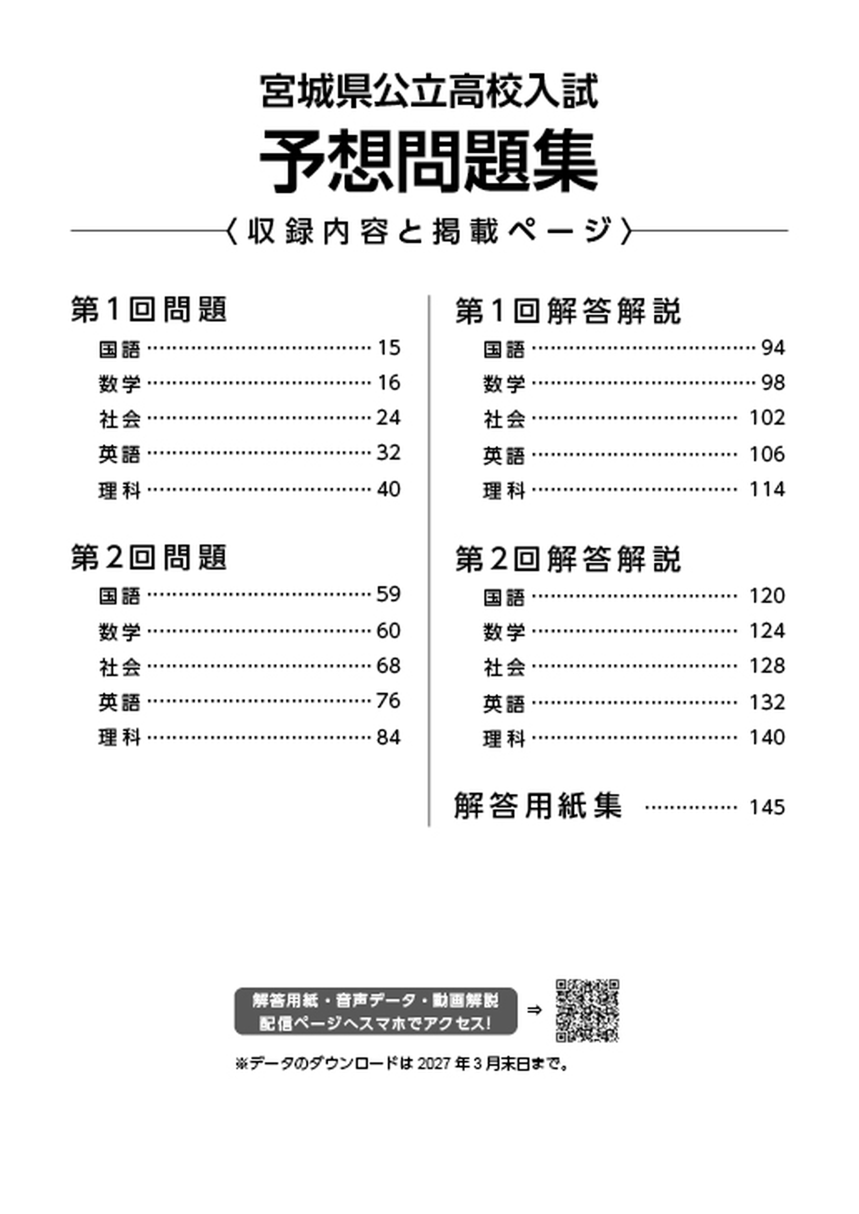 - 宮城県公立高校の予想問題集。5教科各2回分を収録。入試予行演習に最適。